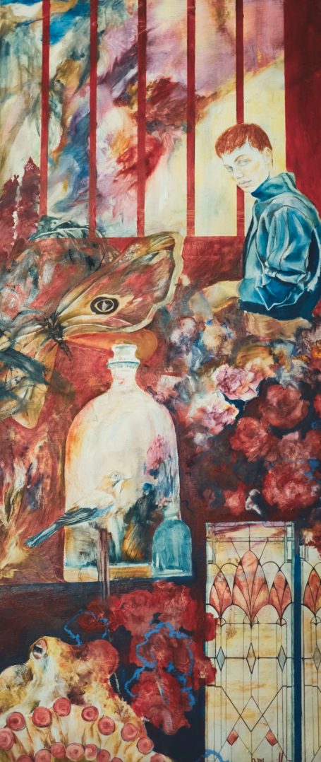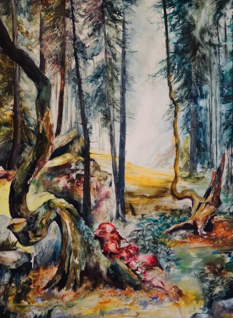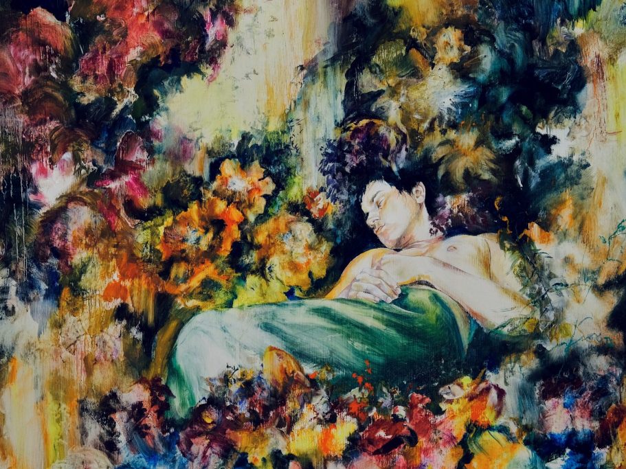Ma démarche artistique se construit donc à partir d’images mentales, de visions et de vécues. Dans mon travail pictural, je mets en scène des figures masculines, contemplatives, perdues, traversant des paysages déconstruits, enchantés, presque menaçants. Je laisse transparaître des ébauches de formes, animaux ou vestiges d’architecture, je dessine un monde dont on ne sait s’il est en train de s’engloutir ou de surgir. Au bout de mon pinceau, la végétation prolifère et vient s’attaquer à la chair. Par une mécanique gestuelle répétée, précise ou lâchée, je suscite des lectures multiples, crée des sensations contraires entre répulsion et fascination, entre rêve et réalité, matière inerte et vivante.