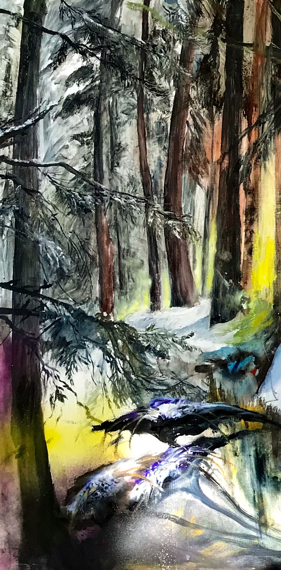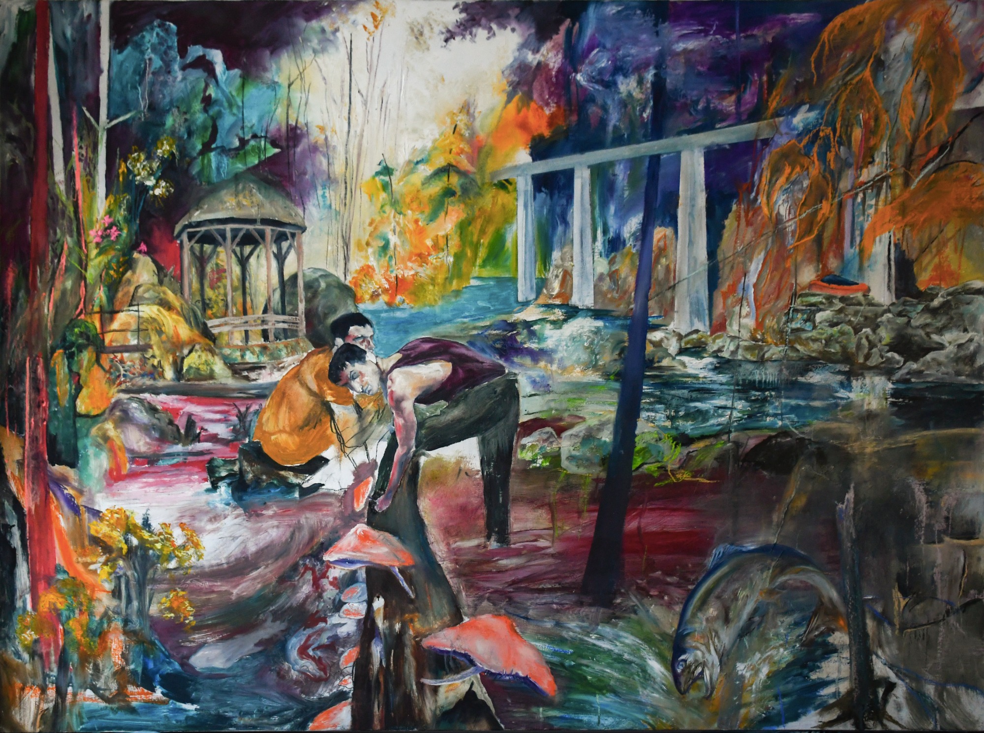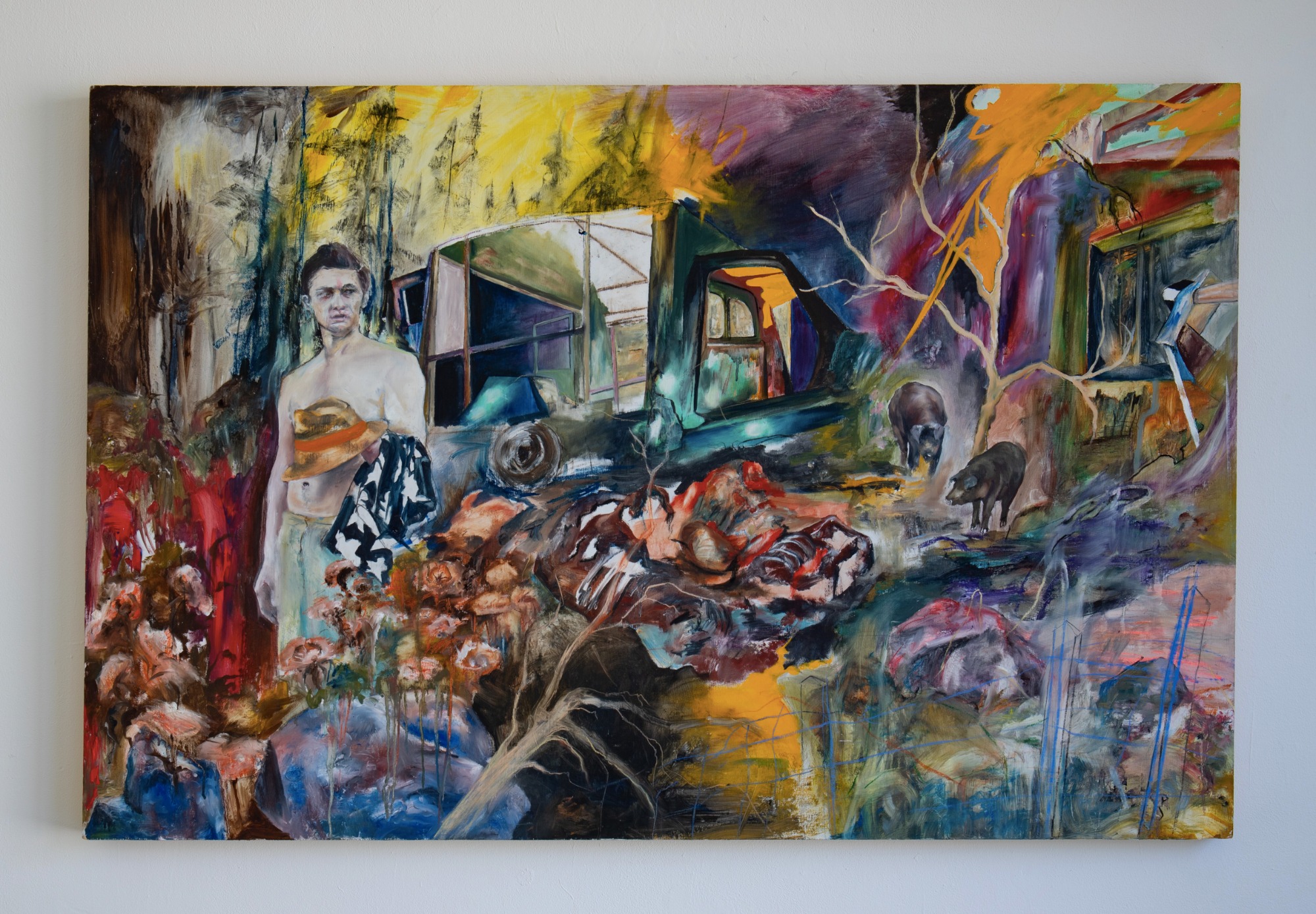 Ma démarche artistique se construit donc à partir d’images mentales, de visions et de vécues. Dans mon travail pictural, je mets en scène des figures masculines, contemplatives, perdues, traversant des paysages déconstruits, enchantés, presque menaçants. Je laisse transparaître des ébauches de formes, animaux ou vestiges d’architecture, je dessine un monde dont on ne sait s’il est en train de s’engloutir ou de surgir. Au bout de mon pinceau, la végétation prolifère et vient s’attaquer à la chair. Par une mécanique gestuelle répétée, précise ou lâchée, je suscite des lectures multiples, crée des sensations contraires entre répulsion et fascination, entre rêve et réalité, matière inerte et vivante.